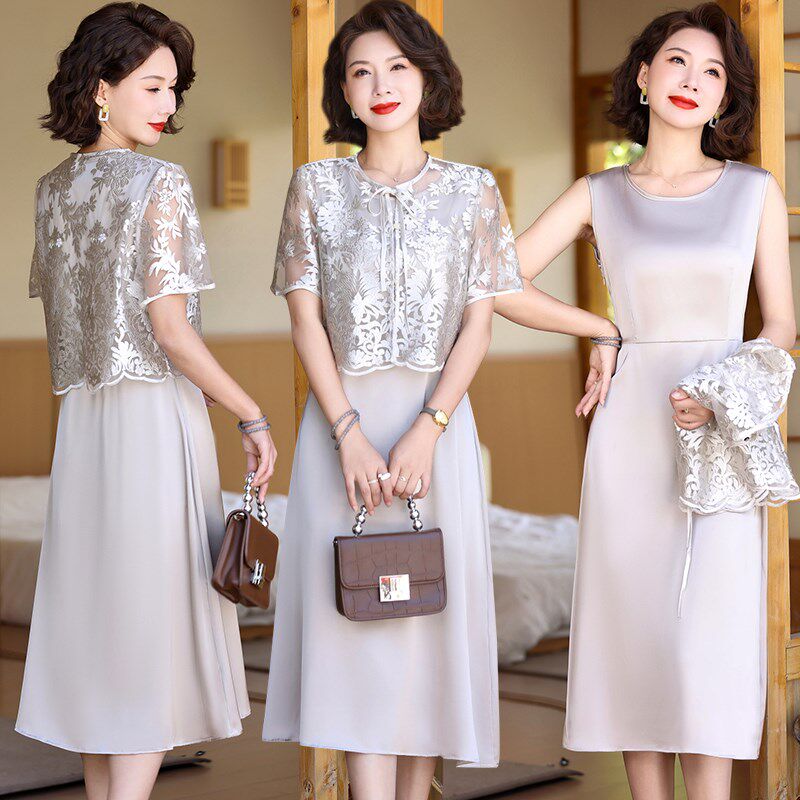 妈妈夏季高贵连衣裙蕾丝两件套装中年气质国风裙子中老年女装短袖