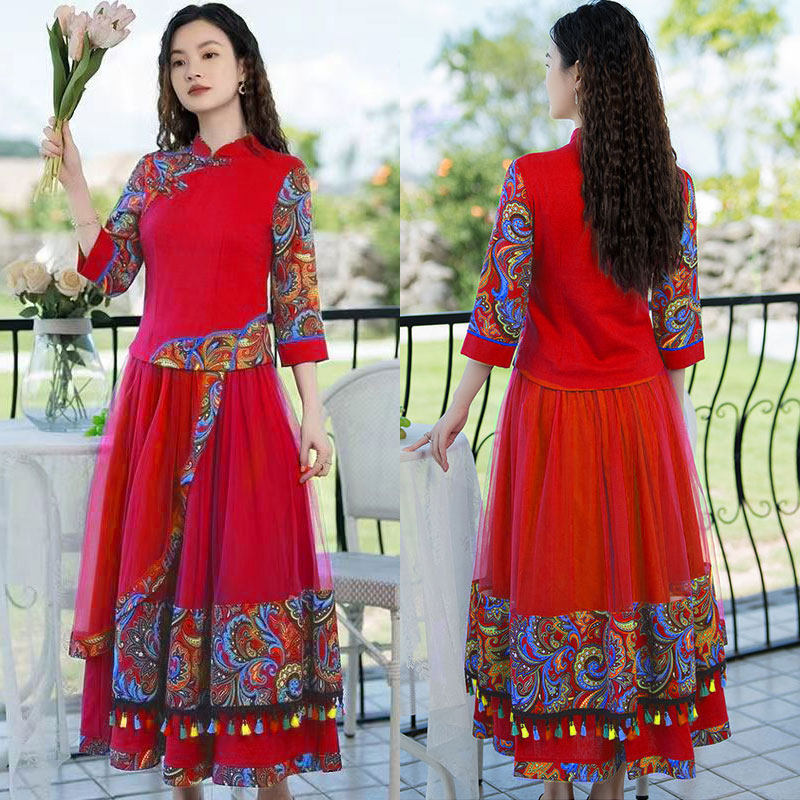 春夏季棉麻套装新款民族风女装复古立领半身裙两件套旅游拍照裙子