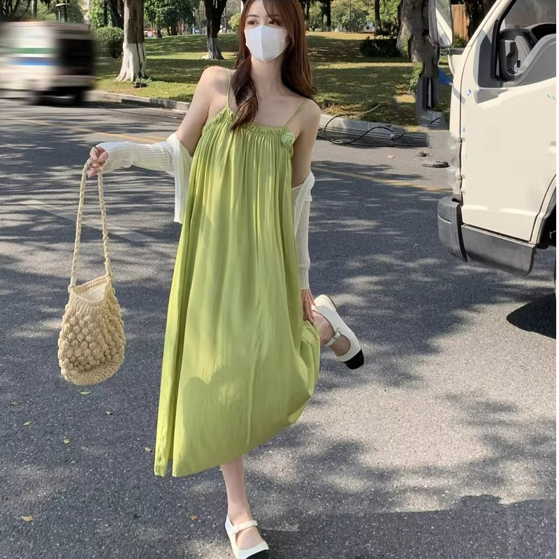 法式吊带连衣裙两件套女夏季绿色裙子搭配防晒衣甜美中长裙子套装