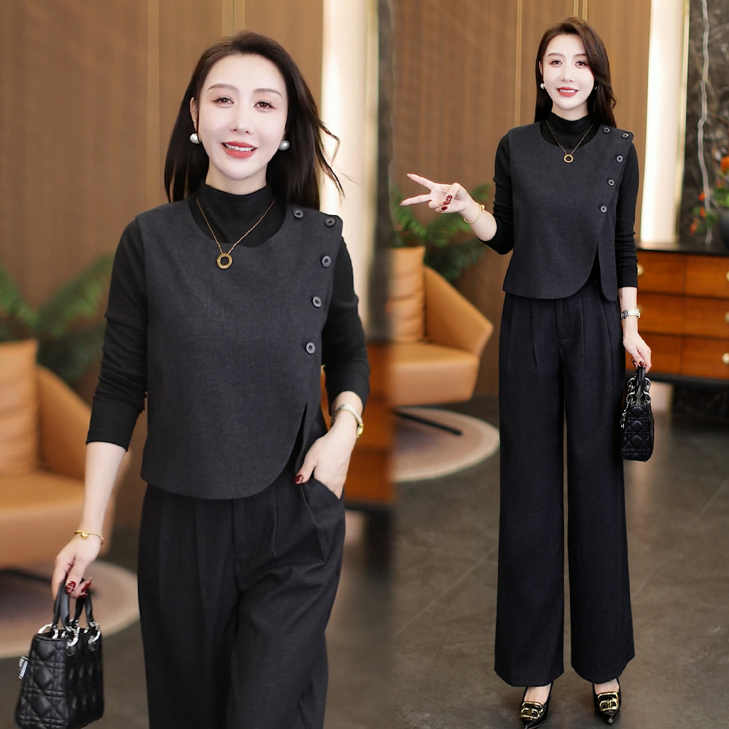 时尚职业套装女2025春秋新款高端气质显瘦减龄马甲阔腿裤三件套