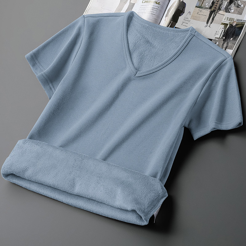 秋冬季短袖t恤男装V领内搭纯色半截袖保暖内衣加绒加厚半袖打底衫