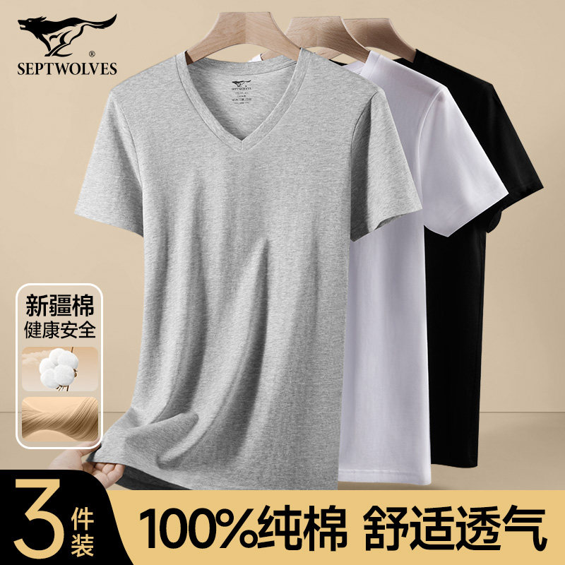 七匹狼男装100%纯棉V领男士T恤短袖老头衫上衣白色背心打底汗衫男