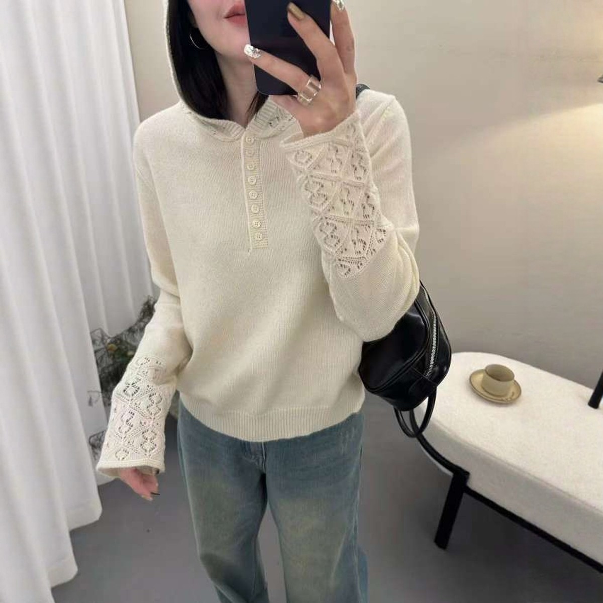 2025秋冬新款韩版宽松浣熊绒连帽蕾丝钩花羊毛针织衫女百搭毛衣潮