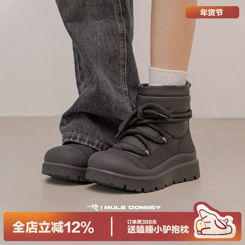 多嘴驴Donkey防滑雪地靴女冬季加绒加厚保暖增高防水黑色厚底棉鞋