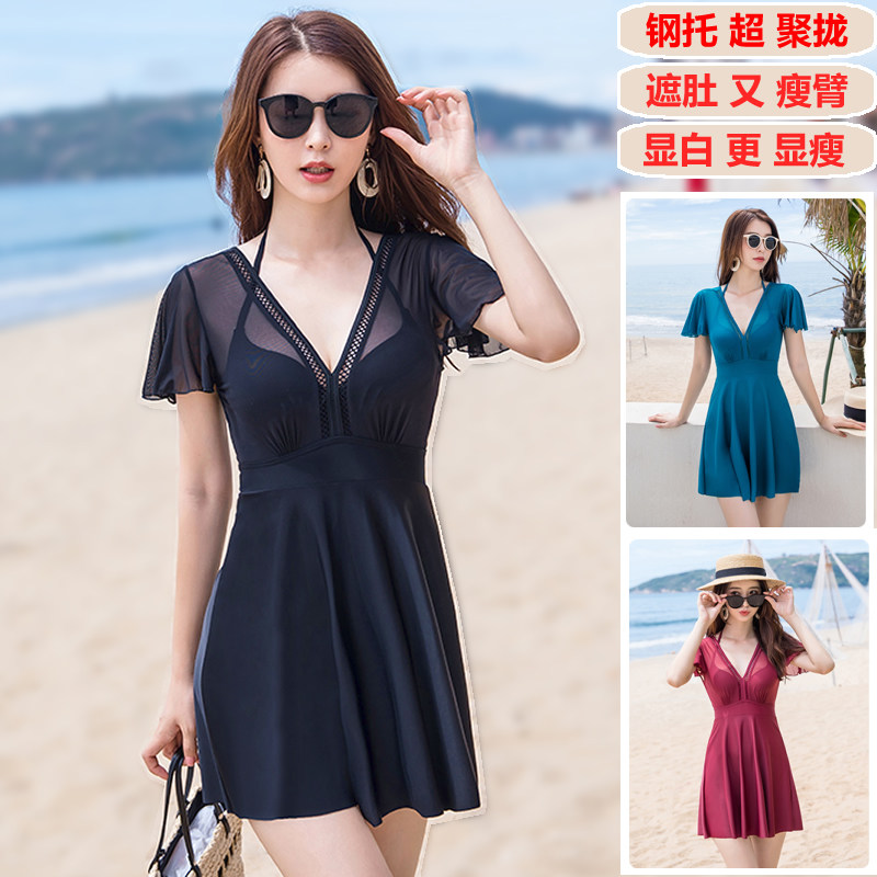 连体泳衣女小胸聚拢带钢托V领A字裙式保守遮肚显瘦微胖泡温泉泳装