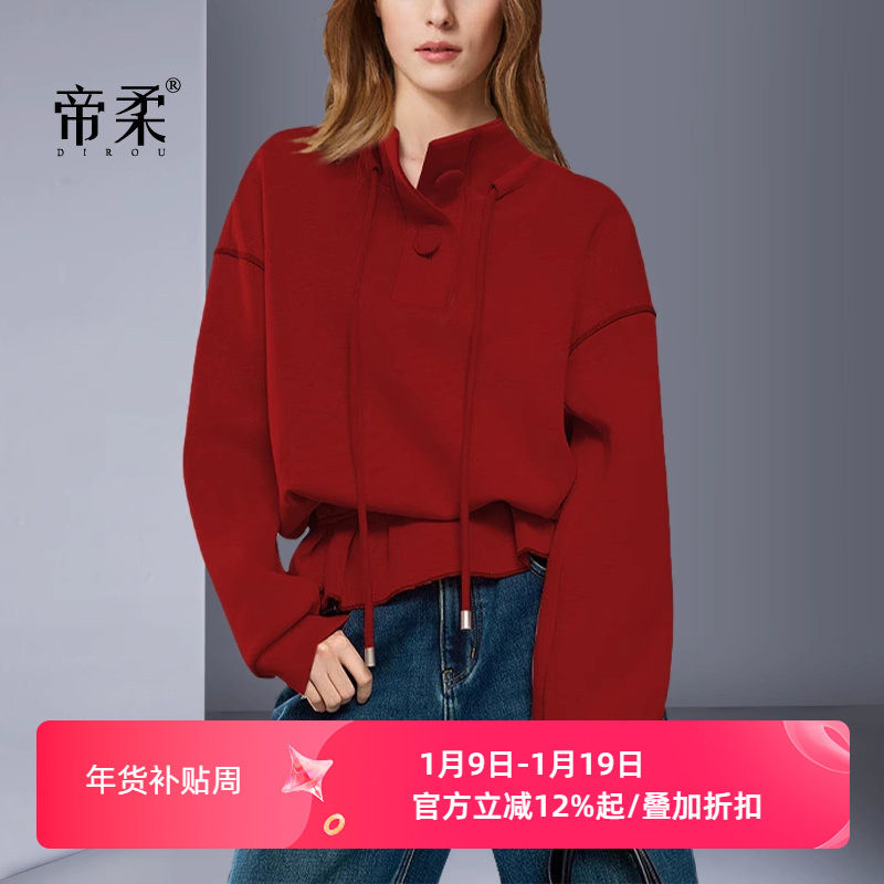 抽绳红色立领卫衣女2025年秋冬新款宽松显瘦百搭设计感短款上衣潮