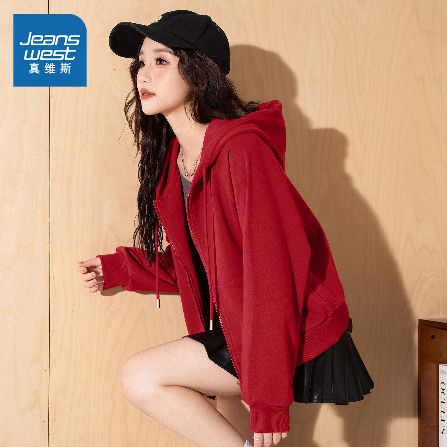 KMV真维斯红色短款连帽卫衣开衫女士2026新款马年本命年运动外套