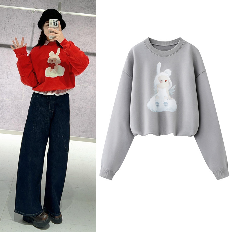 新年红色卫衣2026春季新款趣味卡通小兔子印花圆领短款T恤上衣女
