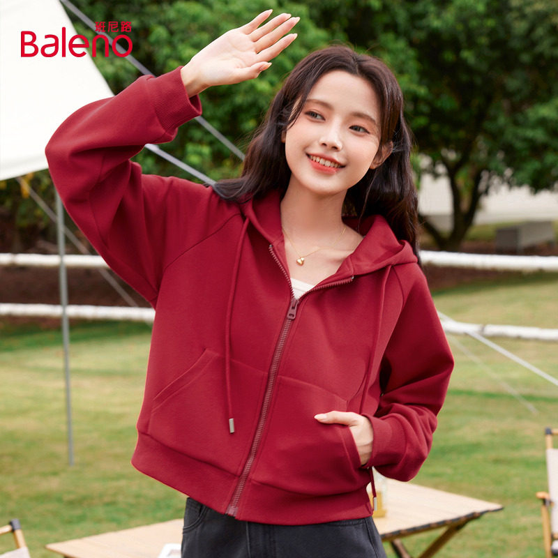 班尼路红色连帽卫衣女2025秋冬新款柔软亲肤小个子短款休闲上衣Q