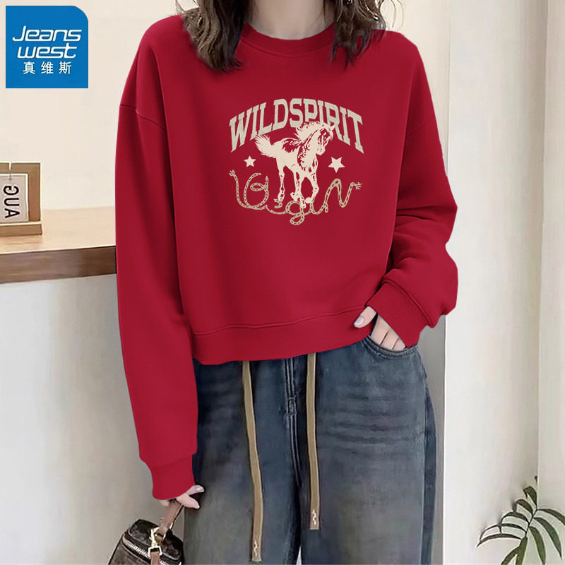 真维斯红色卫衣女2026新款秋冬季短款圆领上衣本命年宽松外套女款