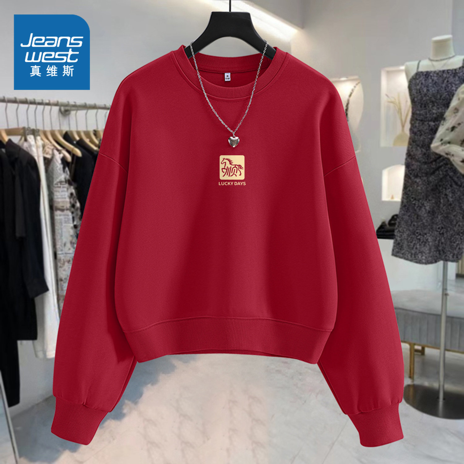 JR真维斯红色短款圆领卫衣女2025新款小个子宽松本命年马年女装