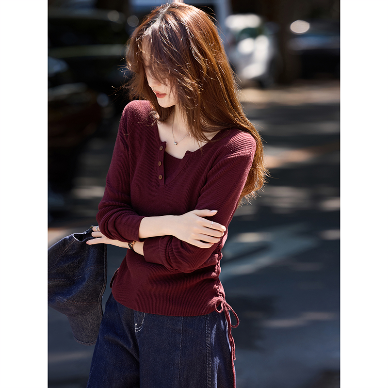 此外 花边V领长袖打底衫女2025冬季新款修身淑女性感内搭T恤百搭