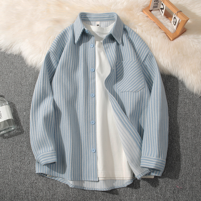 加厚条纹衬衫外套男士韩版潮流帅气复古宽松春秋港风长袖衬衣上衣