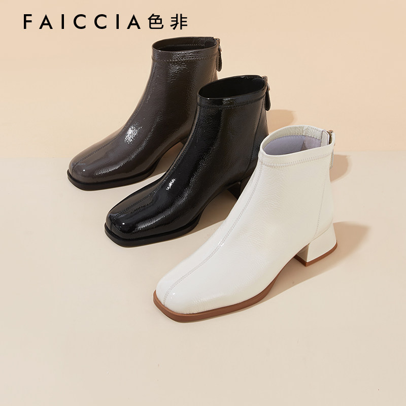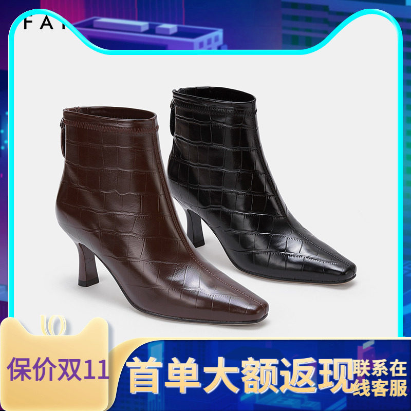 色非气质时装短靴女2025秋冬新款复古粗跟方头后拉链真皮女鞋靴子
