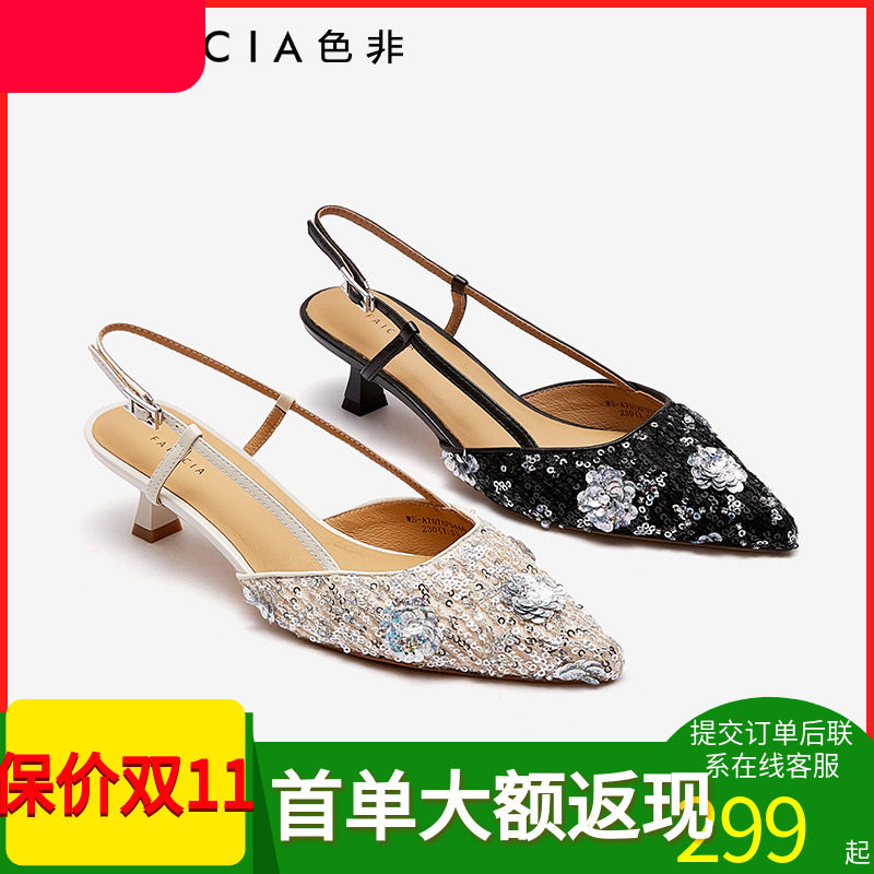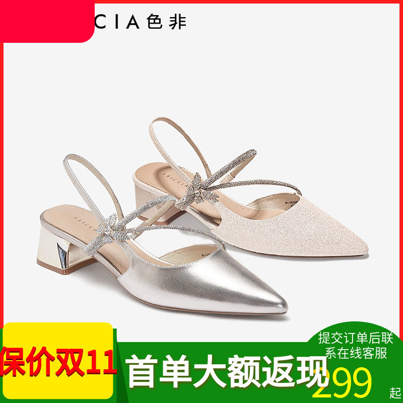 色非法式仙女亮片包头细跟尖头凉鞋女2025夏季新款后空粗跟高跟鞋