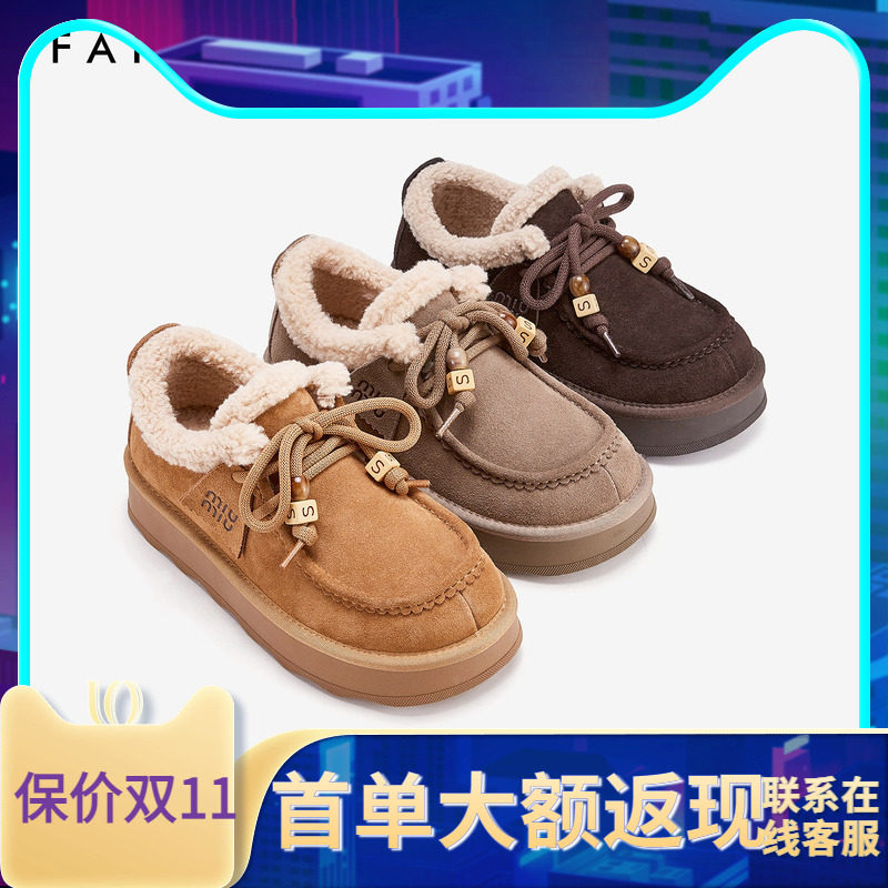 色非厚底系带加绒勃肯单鞋女2025冬新款保暖舒适毛毛雪地靴休闲鞋
