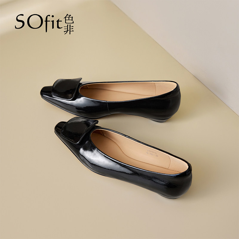 色非真皮通勤单鞋女2026新款春季方头亮面工作鞋气质粗跟浅口女鞋