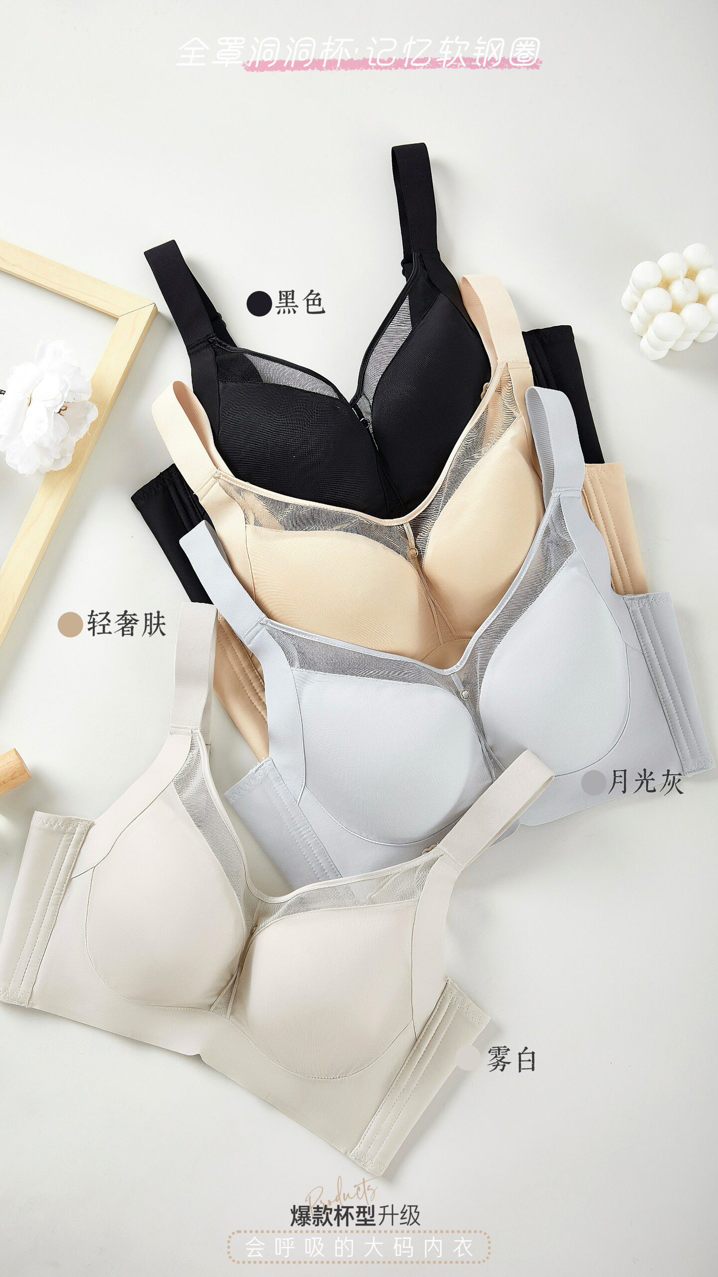网纱超薄款文胸大罩杯收副乳防下垂无磁洞洞杯大胸显小内衣女聚拢