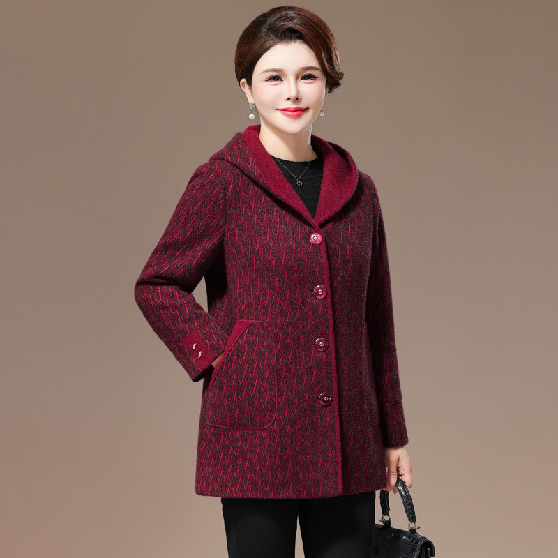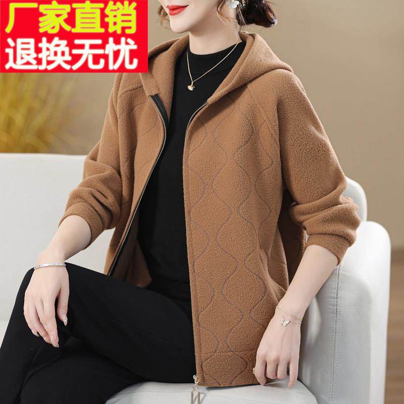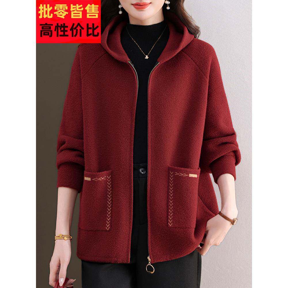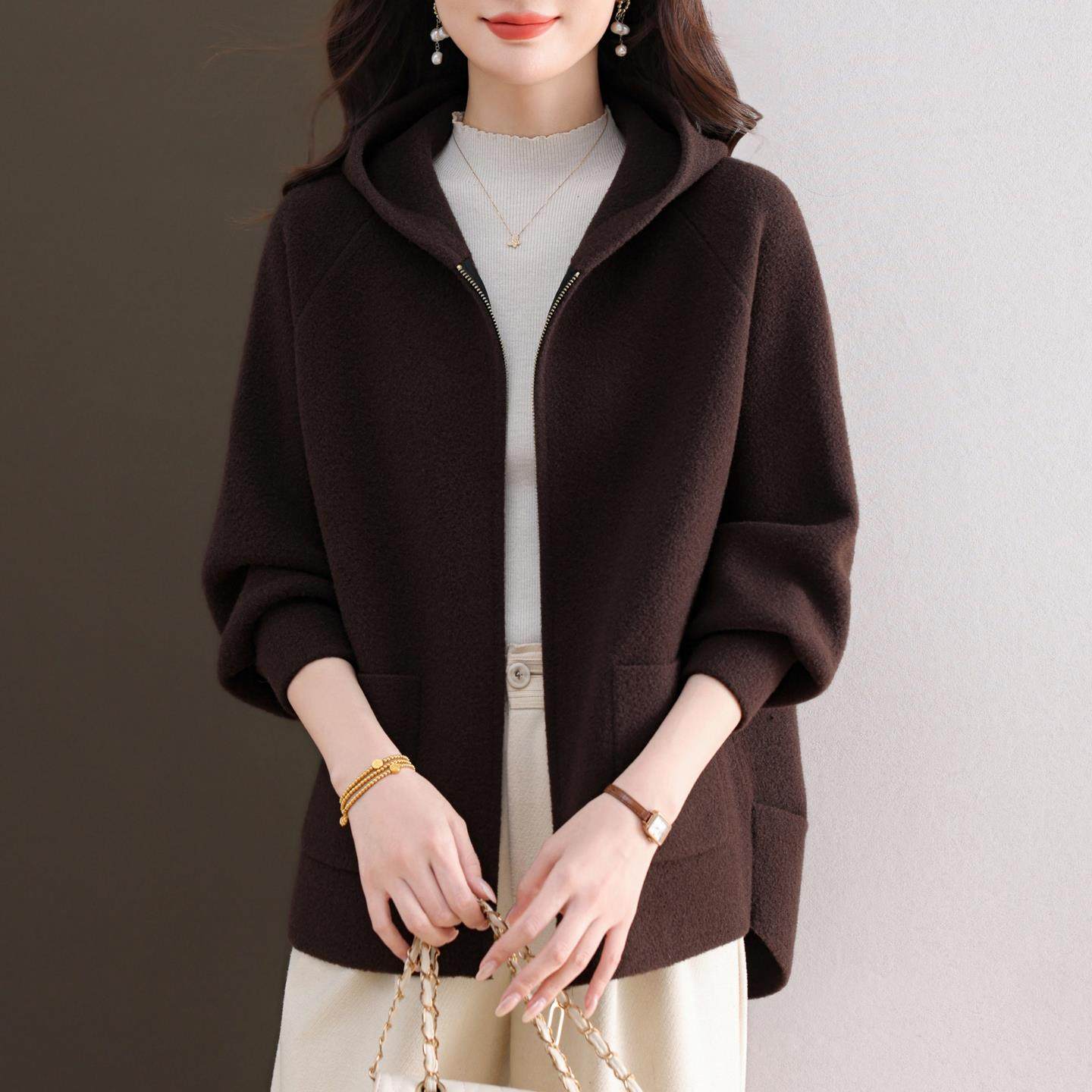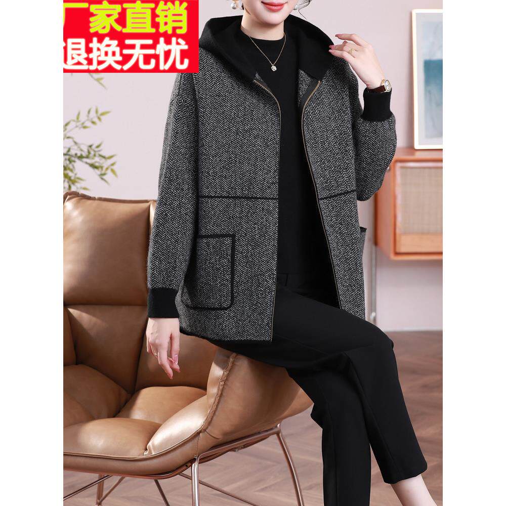 2025秋冬妈妈装加大码毛呢外套胖mm女中老年宽松双面羊绒连帽上衣