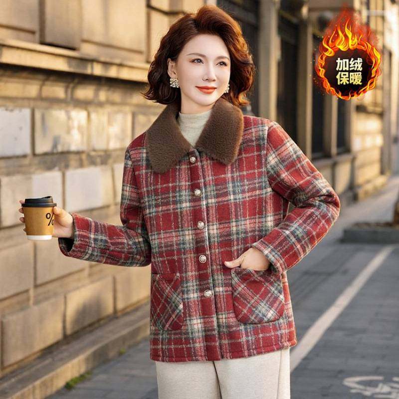 官方中老年女装加绒大码毛呢外套新款时尚洋气质格子宽松上衣服女