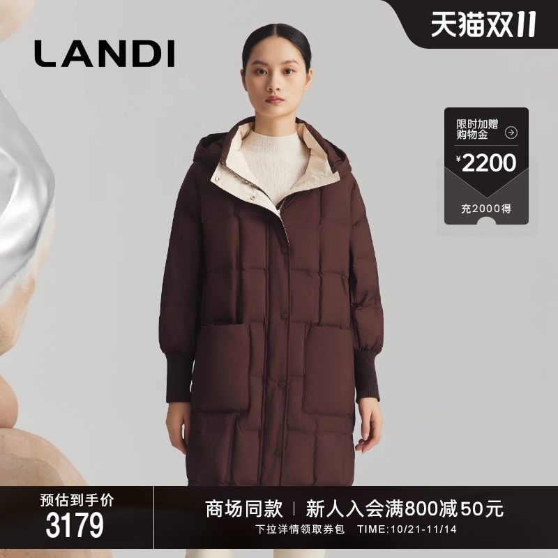 [商场同款]LANDI立领连帽90白鹅绒撞色宽松羽绒服女中长款冬新品