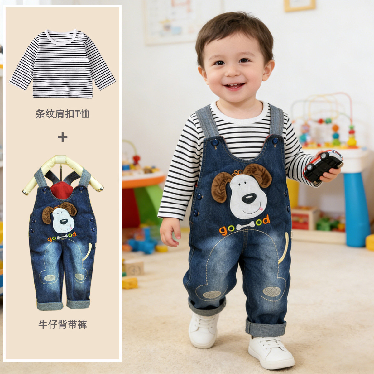 骨头狗男宝宝牛仔裤打底衫儿童背带裤套装单层卡通长裤子潮款春秋