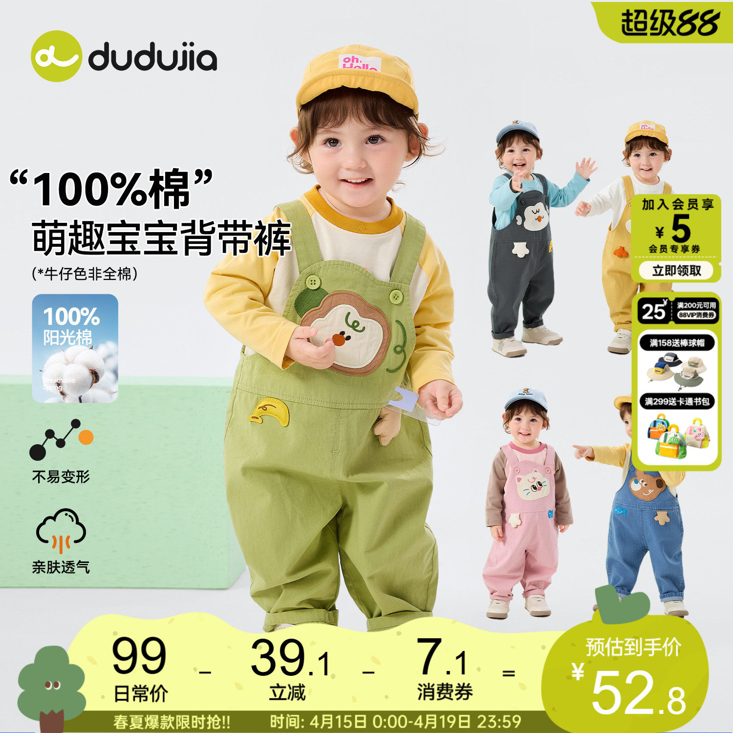 【纯棉】dudujia男童裤子春季儿童背带裤卡通女童长裤宝宝春装秋