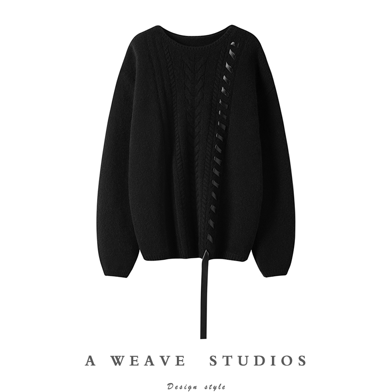 时髦大奢货!绸缎绑带~加厚羊绒衫女圆领纯羊绒毛衣套头绞花上衣