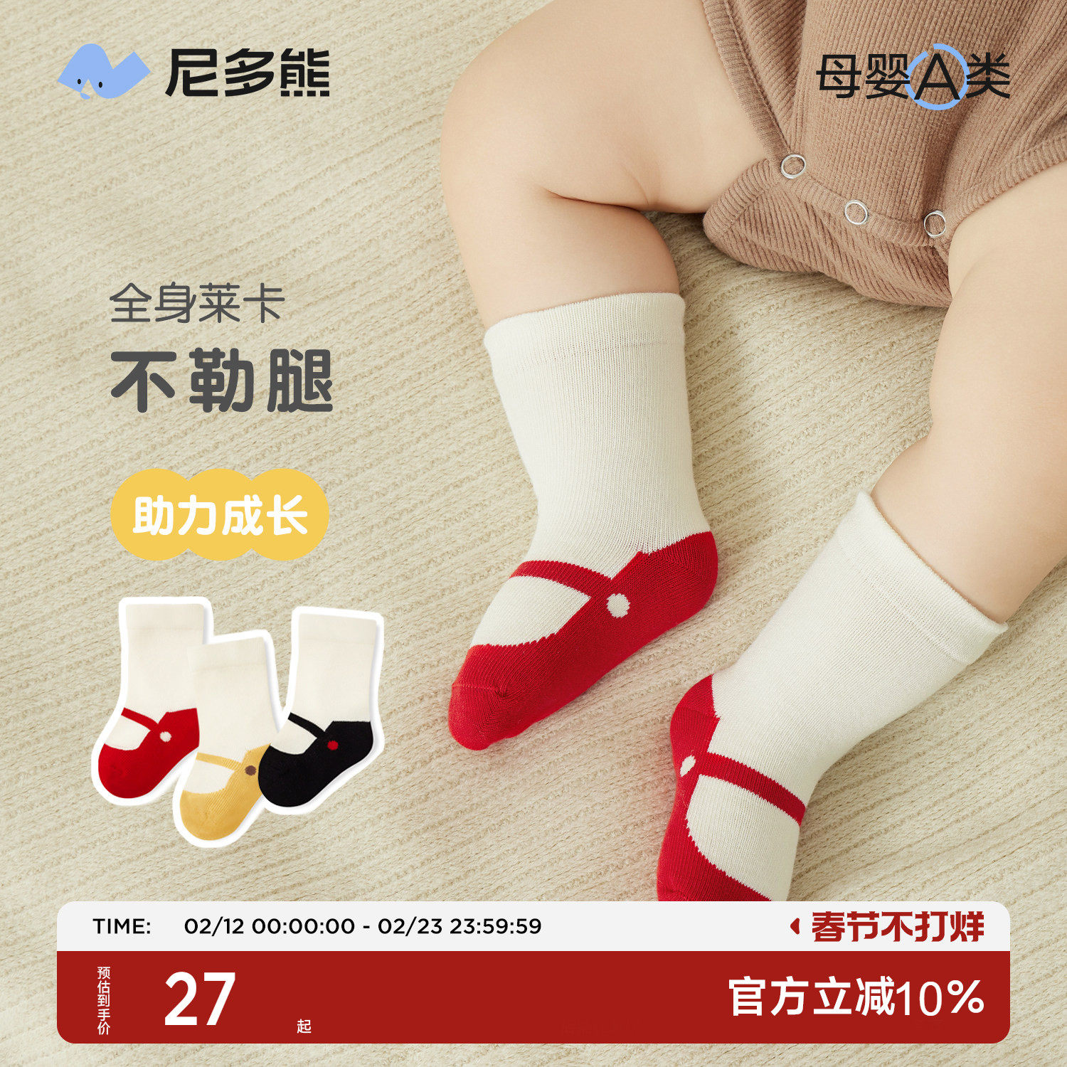 尼多熊新生婴儿袜子秋冬棉袜a类女宝宝中筒袜松口无骨可爱不勒腿