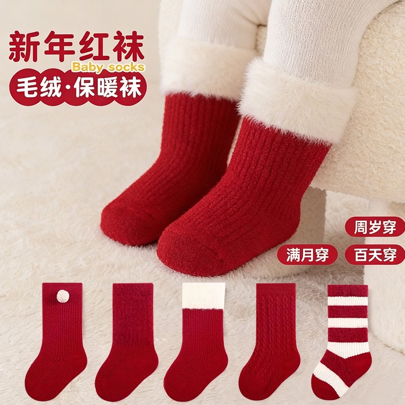 婴儿袜子加绒加厚秋冬季保暖新生儿宝宝满月周岁新年松口大红色袜