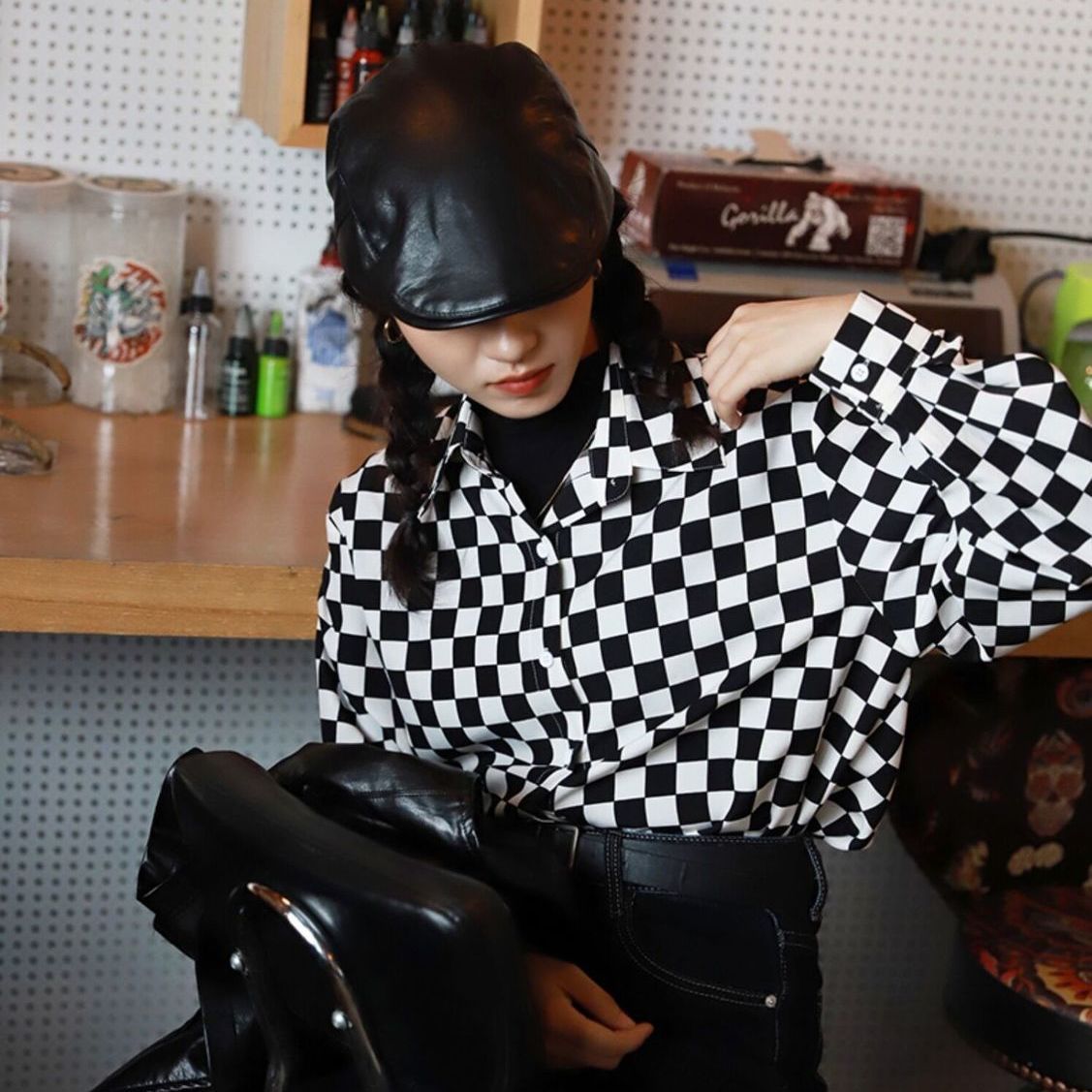 唐狮2025年新款长袖衬衫女黑白格子翻领美式复古上衣宽松外套潮bl