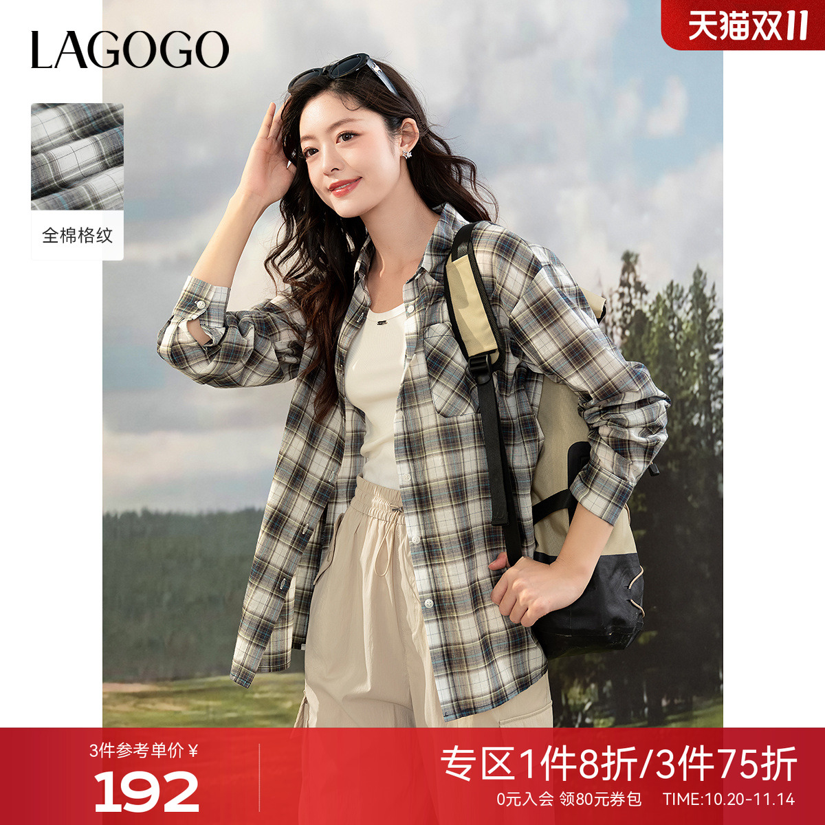 LAGOGO黑白格子纯棉长袖衬衫女拉谷谷2025新款夏秋宽松休闲上衣