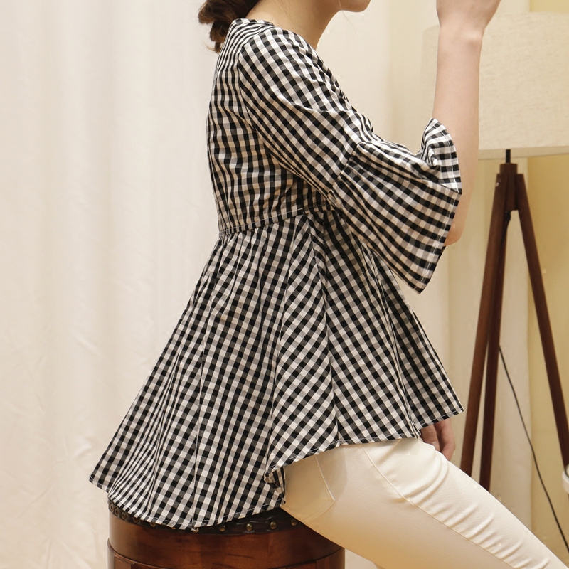 黑白格子衬衫女修身圆领娃娃衫七分喇叭袖前短后长大摆型上衣夏季