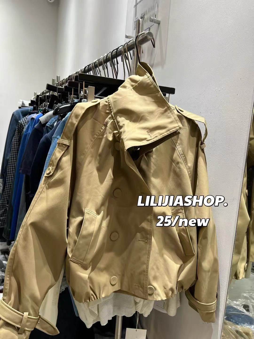范洛休闲短款风衣外套女2025春新款双排扣小个子高级感卡其色大衣