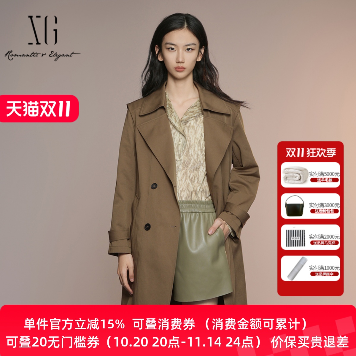 XG/雪歌2025年秋季新款翻领双排扣风衣女中长款外套XK308001A209
