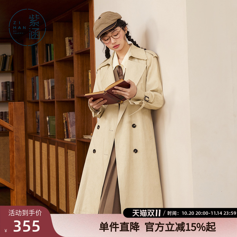紫涵双排扣风衣女秋季新款复古英伦风通勤高级垂感休闲中长款外套