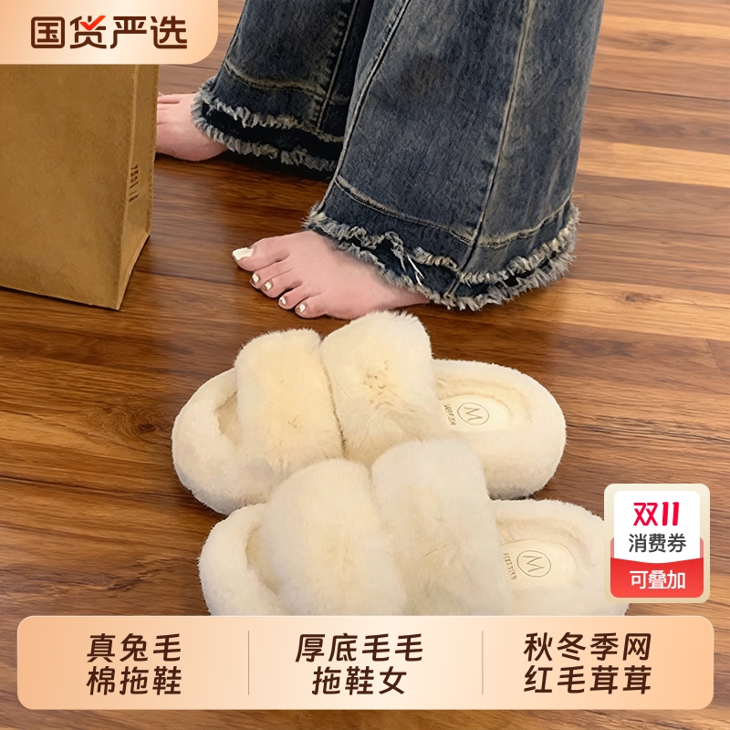 真兔毛厚底毛毛拖鞋女外穿2025新款秋冬季网红毛茸茸高级感棉拖鞋