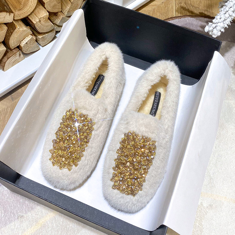 毛毛鞋女外穿2025新款秋冬季软底平底水钻单鞋兔毛加绒方头豆豆鞋