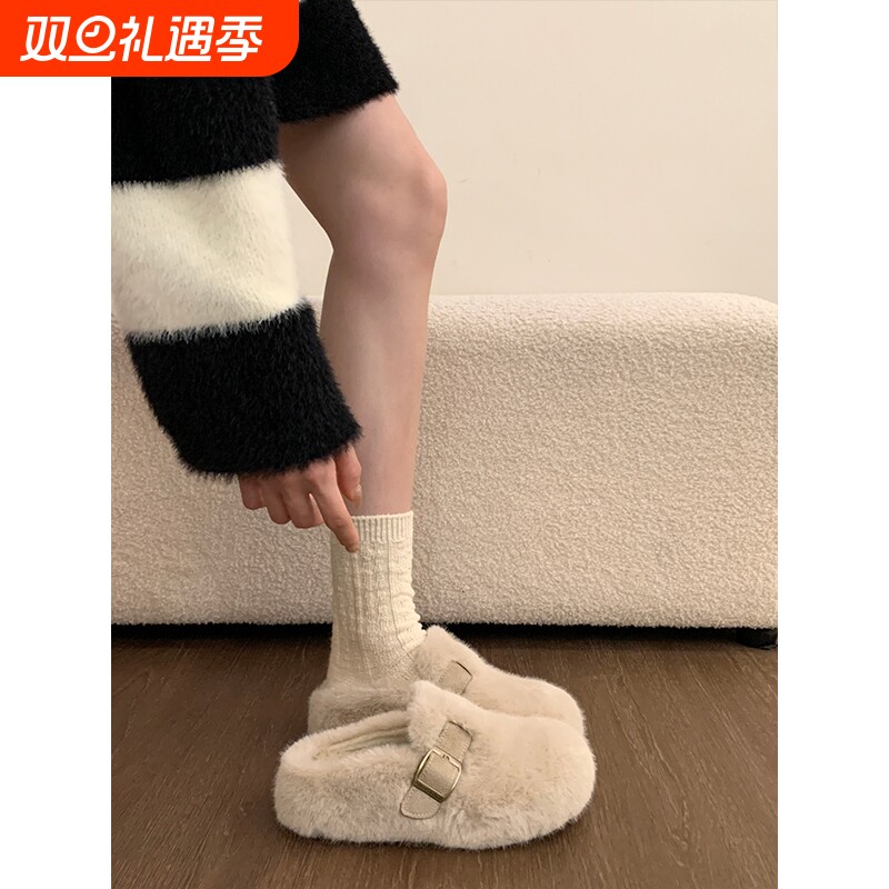 厚底加绒保暖兔毛勃肯鞋包头半拖鞋女外穿2025秋冬新款毛毛棉拖鞋