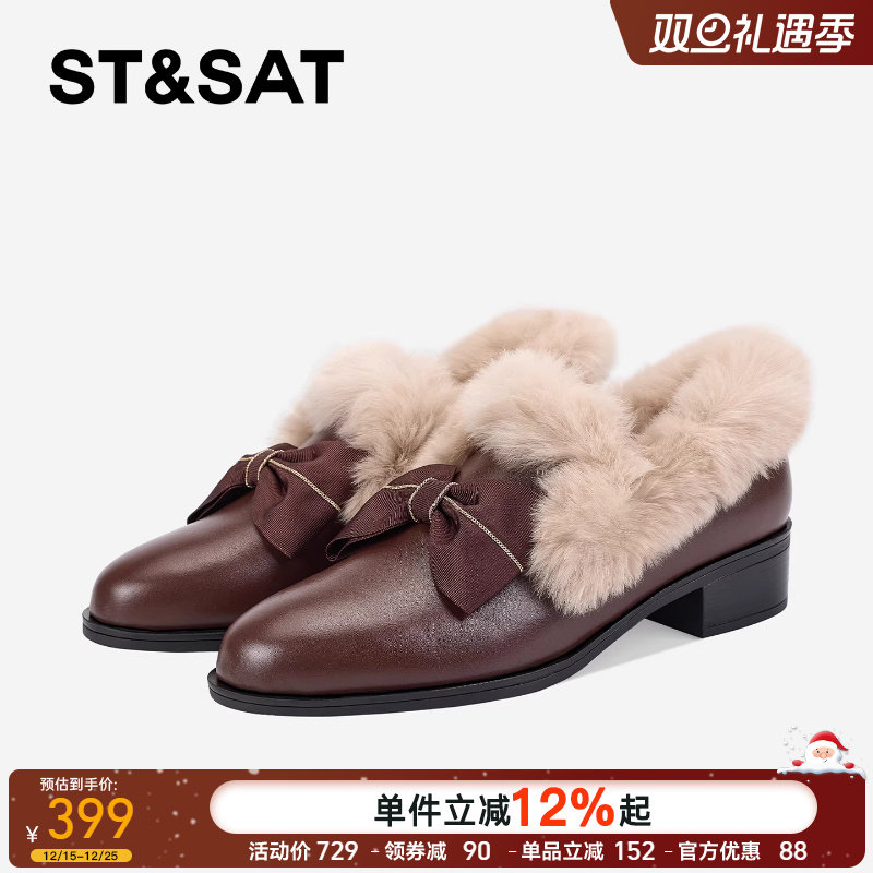 星期六毛茸茸毛毛鞋女2025春季新款蝴蝶结装饰中跟兔毛加绒小皮鞋