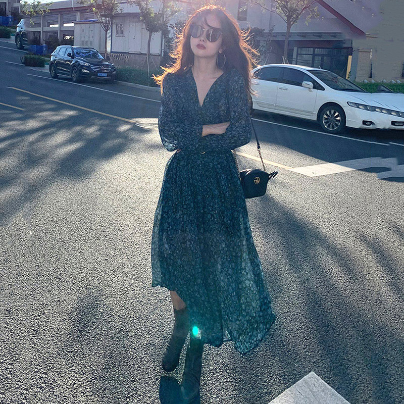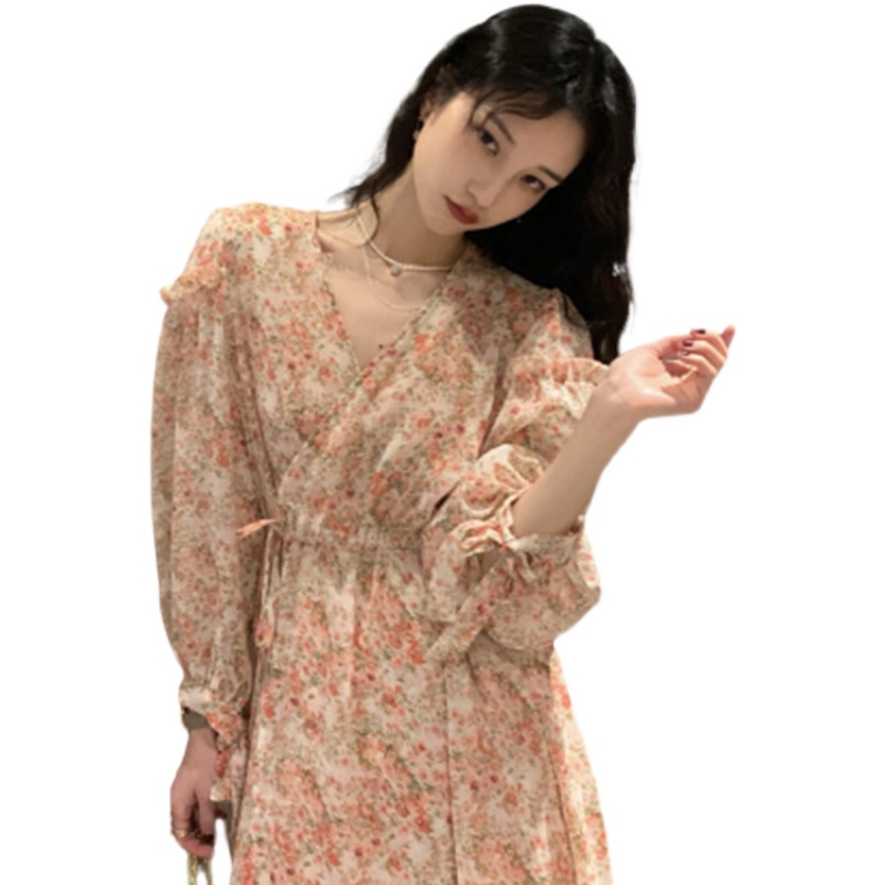 FAshi 2023春装新款气质纯欲风碎花雪纺连衣裙子法式洋气淑女长裙
