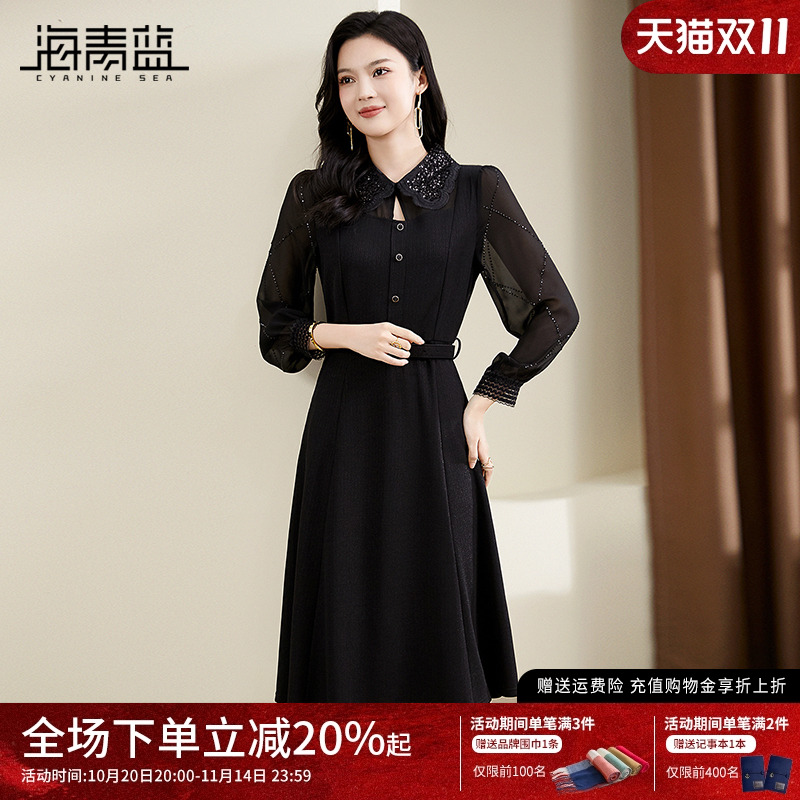 海青蓝黑色长袖雪纺连衣裙2025春装新款钉钻翻领气质显瘦中长裙