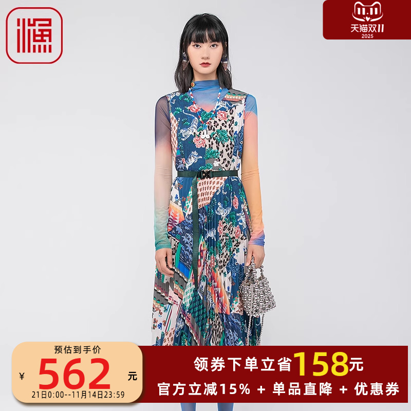FISHING春装女2024年新款女撞色印花微弹雪纺无袖连衣裙FGGA0098