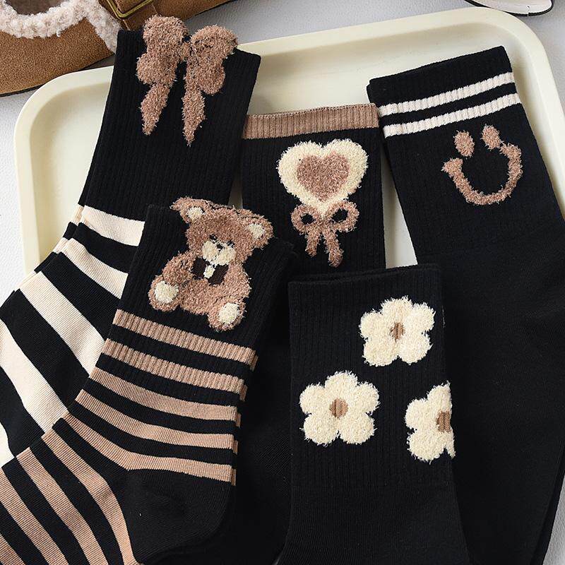 秋冬袜子女中筒袜黑色百搭韩版长筒袜棉袜羽毛纱毛绒小熊袜ins潮