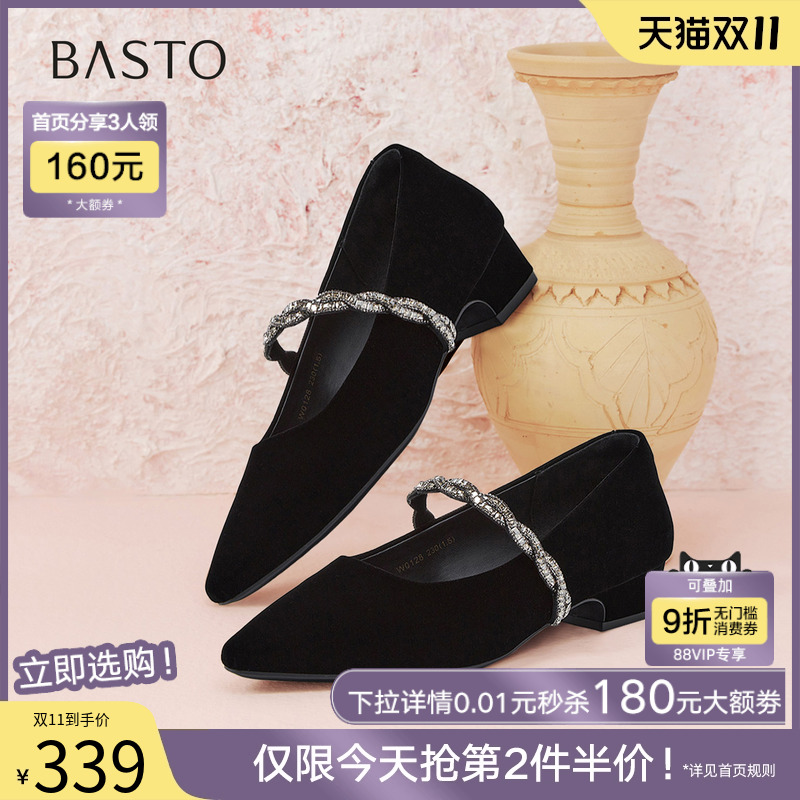 百思图2025秋季商场新款尖头粗跟绒面玛丽珍鞋法式女单鞋W0128AQ6