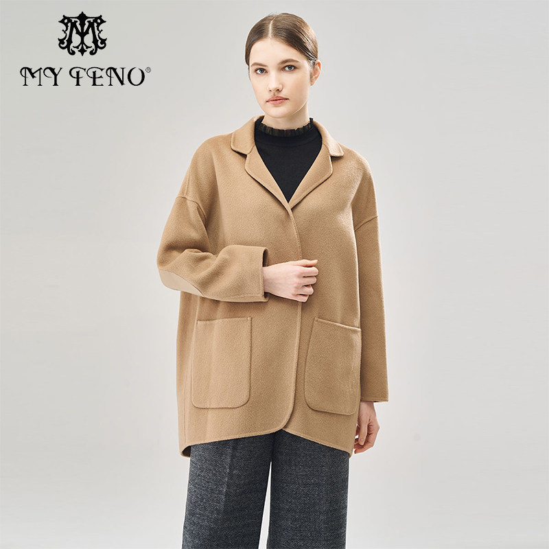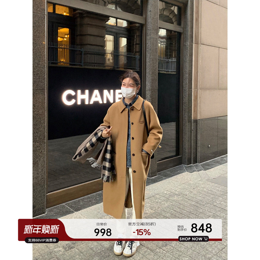 素依阁新款秋冬慵懒风大翻领双面羊绒大衣女中长款驼色毛呢外套女