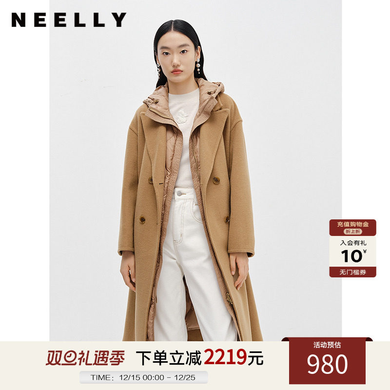 NEELLY纳俪商场同款驼色毛呢大衣中长款连帽羽绒马夹可脱卸两件套