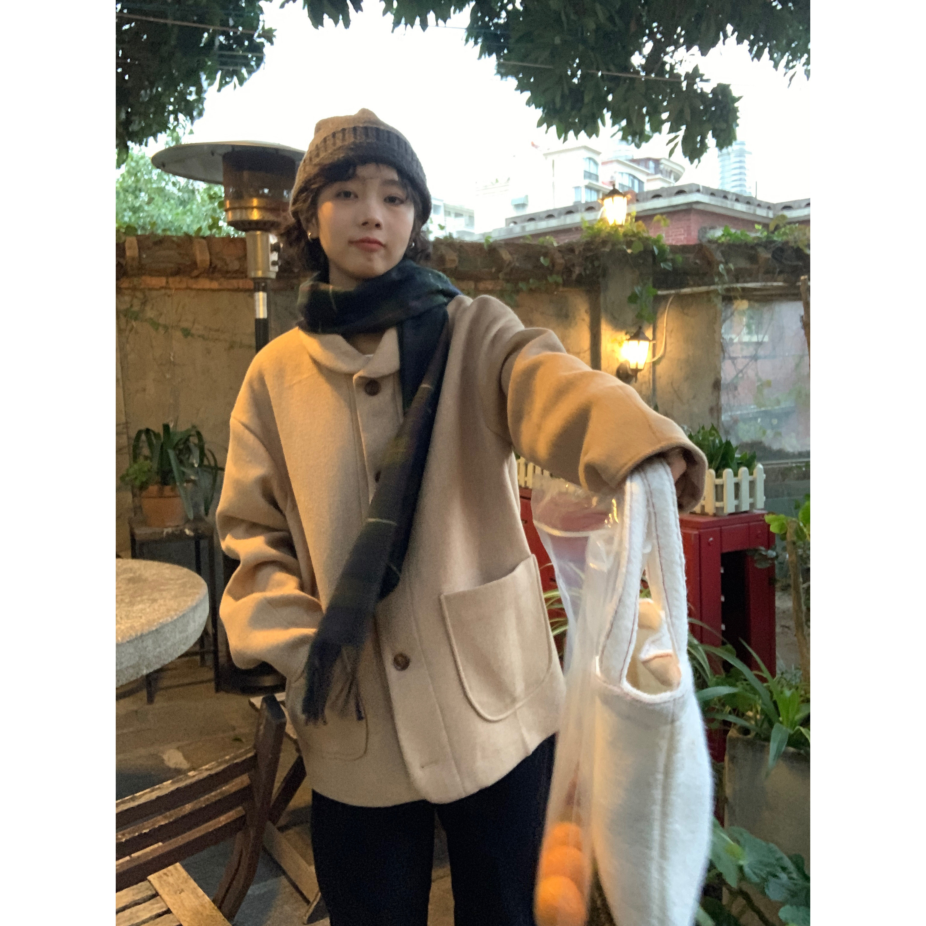 ifbeer50羊毛夹棉驼色毛呢加厚夹棉外套娃娃领直筒宽松复古秋冬女
