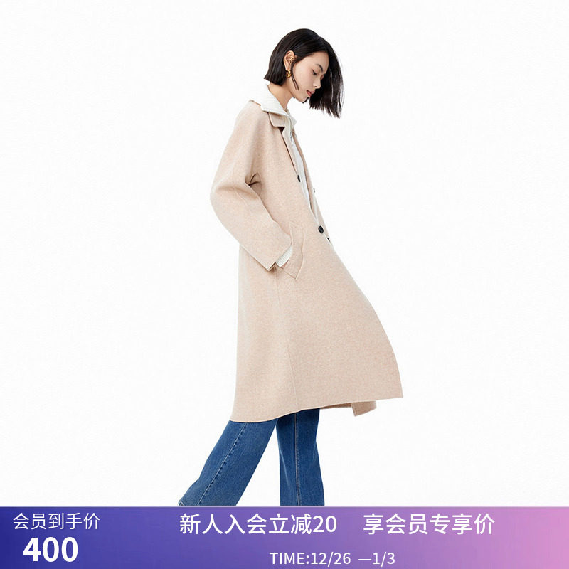 ONLY秋季绵羊毛双面呢西服领双排扣老钱风中长款驼色毛呢大衣女