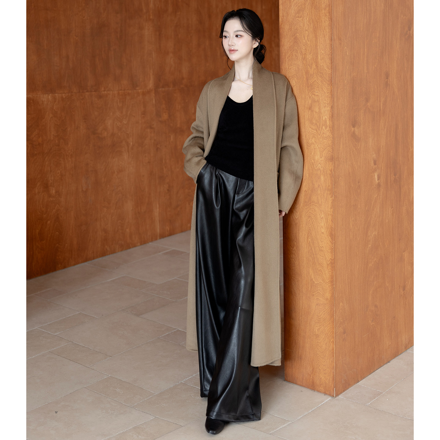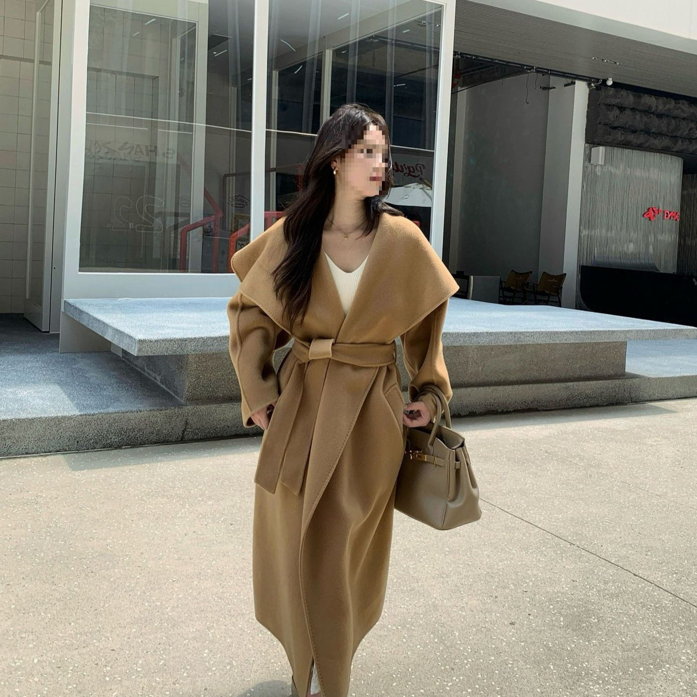 2025秋冬新款M家驼色双面羊绒大衣女大翻领系带长款羊毛呢外套厚